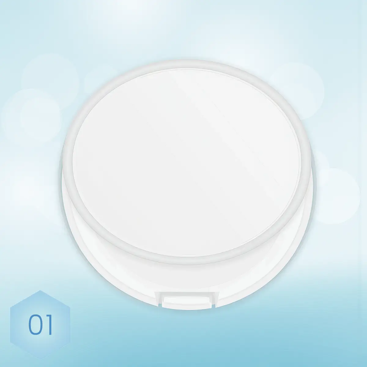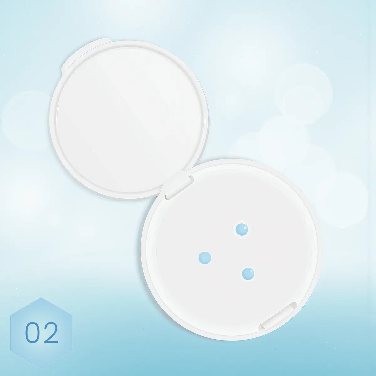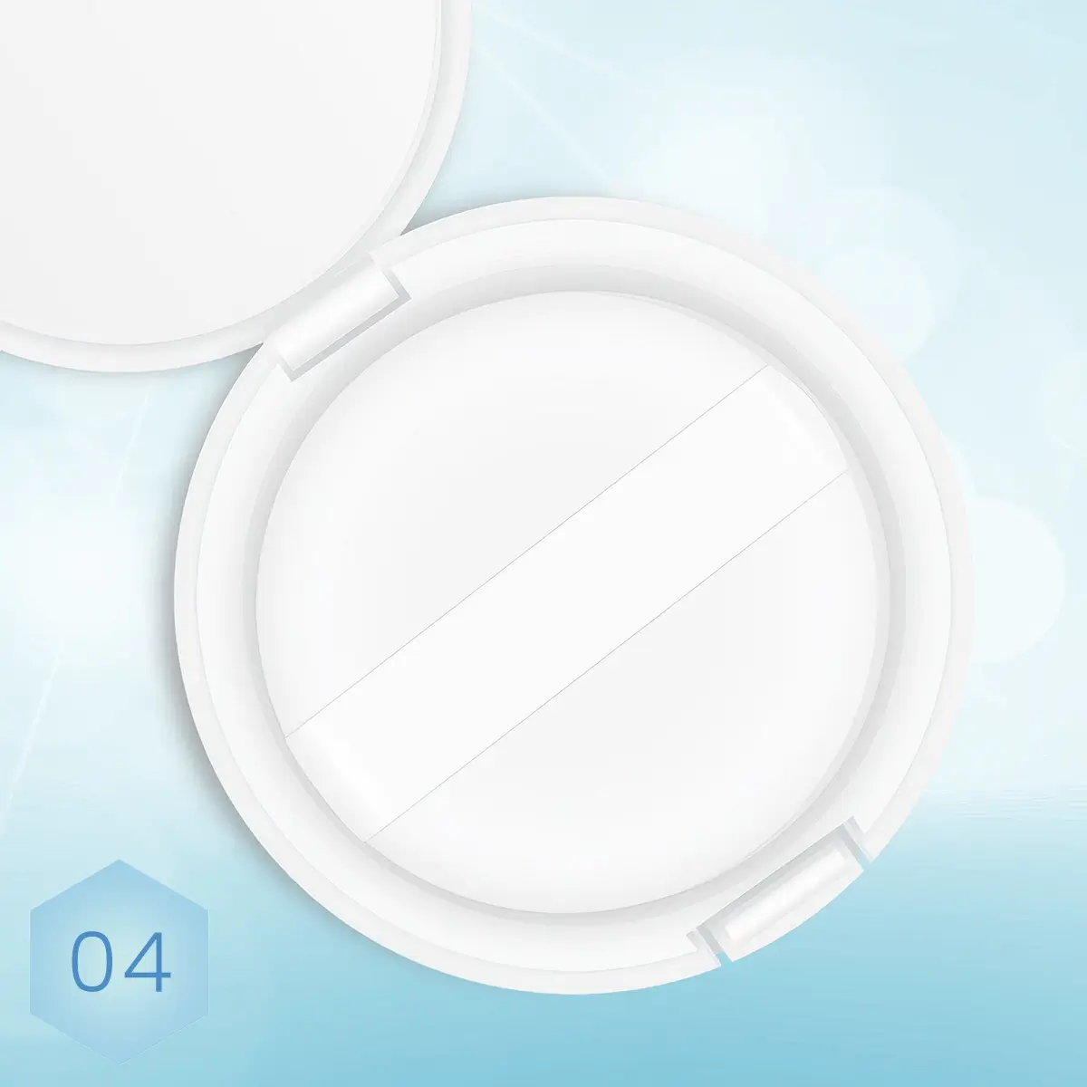 容器の内部(プレストパウダーの受け皿部分など)に、ホットメルト(熱可塑性接着剤)を数点塗布し、充填後に内容物(パウダー)をしっかりと固定できるようにします。