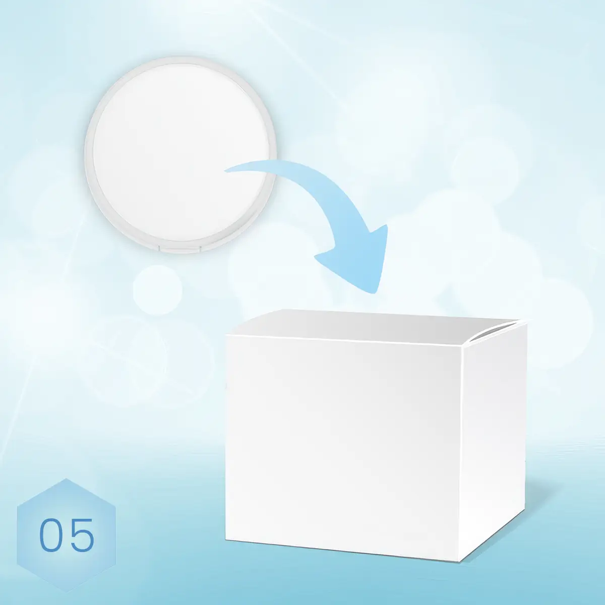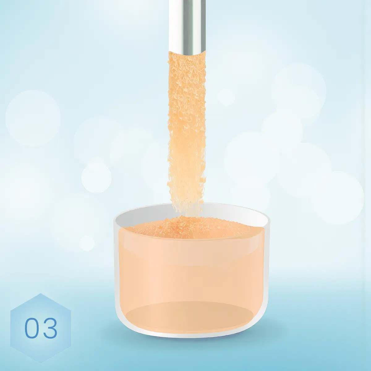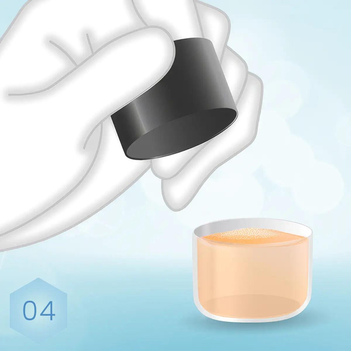 計量機または自動充填機を使用し、決められた量のパウダーを容器に充填し、一定の圧力でプレスして固形化します。