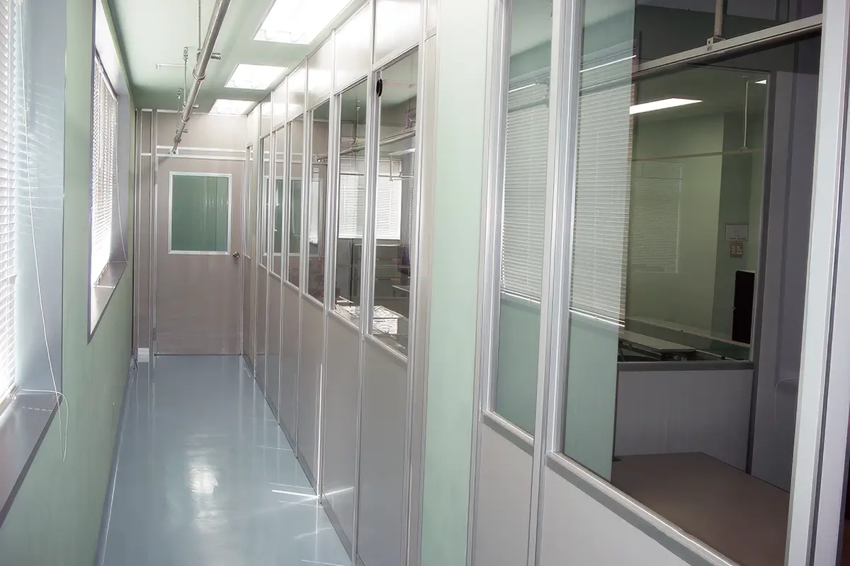 製造エリアはISOクラス7(清浄度10,000)の基準を満たしたクリーンルームで構成され、外部からの粉塵や異物混入を防ぐための陽圧管理システムを導入。